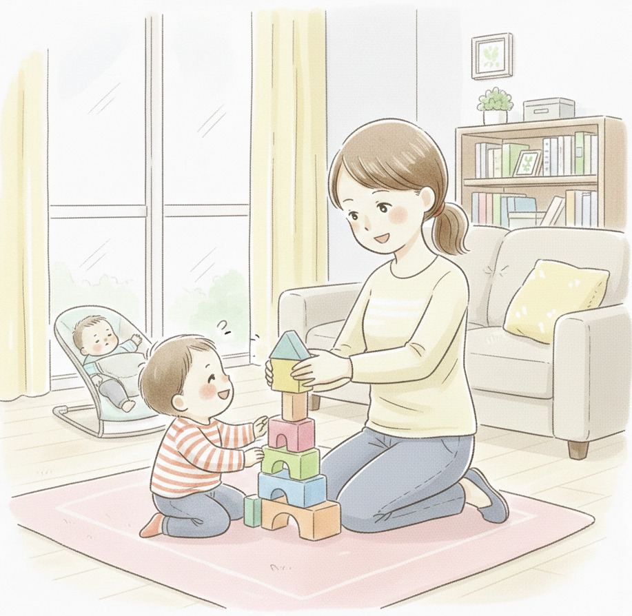0歳の子が泣き出したと思ったら、3歳の子が「ママ」と呼ぶ声が。