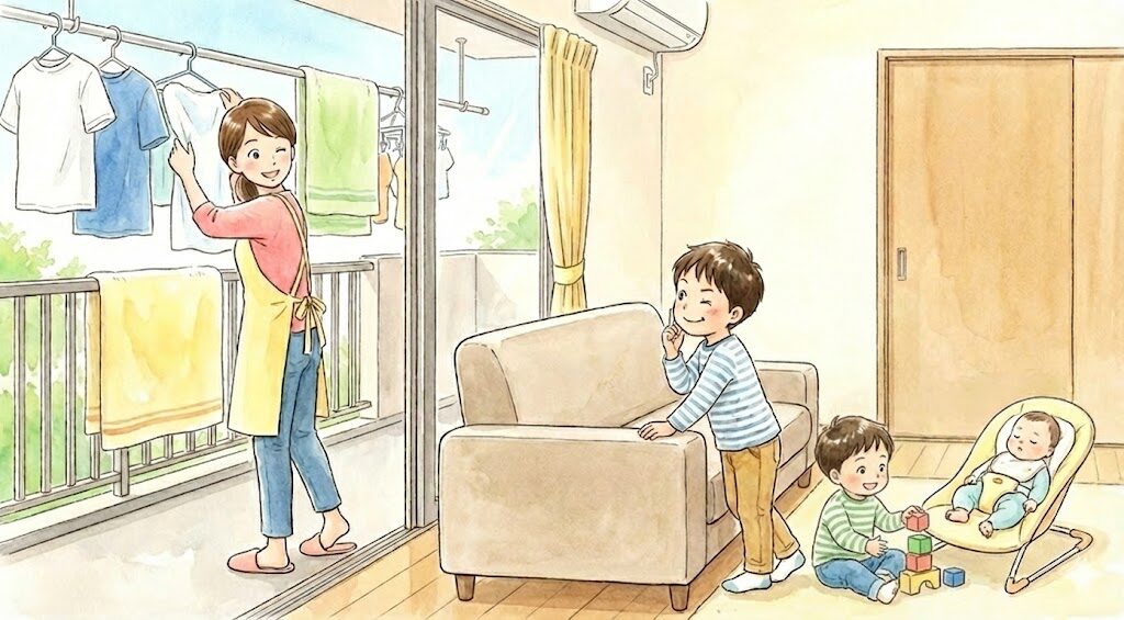 子ども3人の寝かしつけ中、溜まった洗濯物と流しに残った食器が頭から離れない。