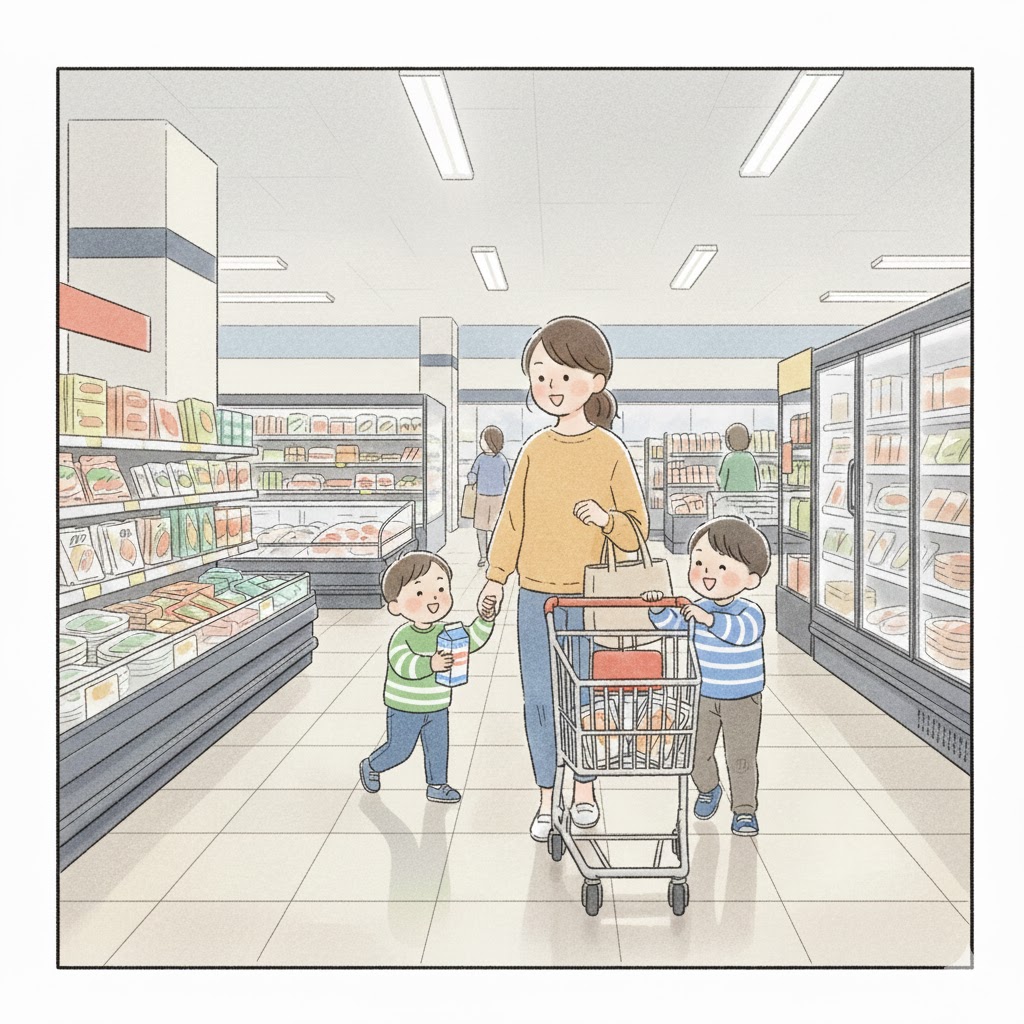 • かごを押す係、商品を入れる係など役割を決めると兄弟ケンカの防止になる