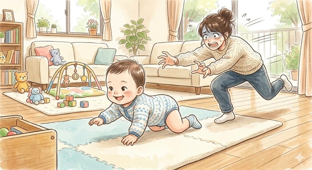 おとなしくしてほしいのにハイハイして走り回るの。