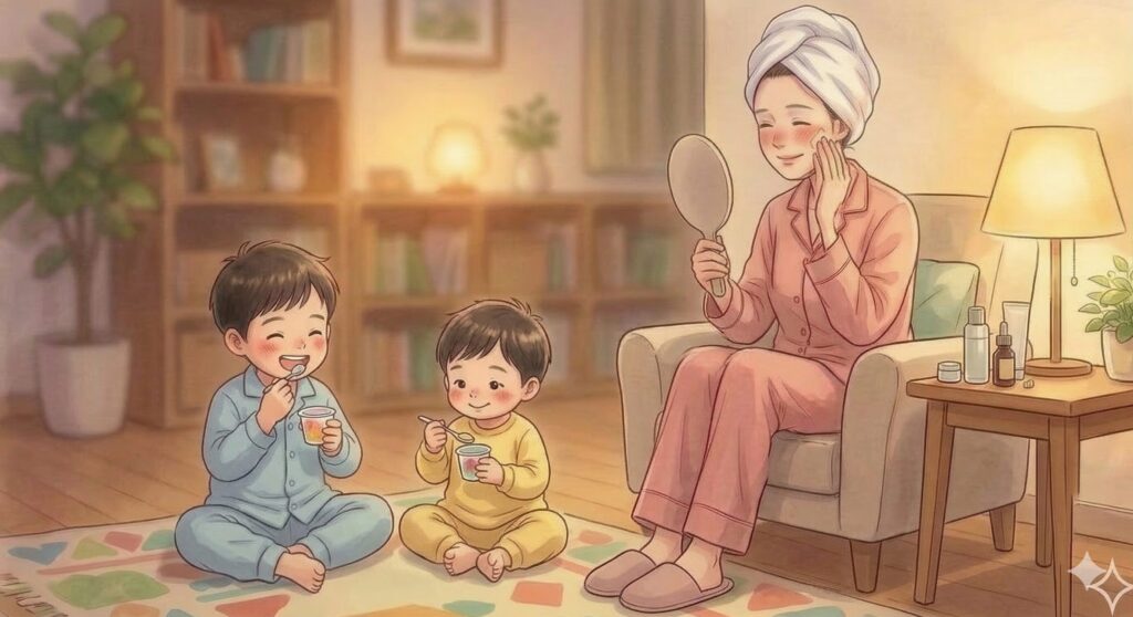 3. 子どもがゼリーを食べたりテレビを見ている間に、自分のスキンケアをゆっくりする