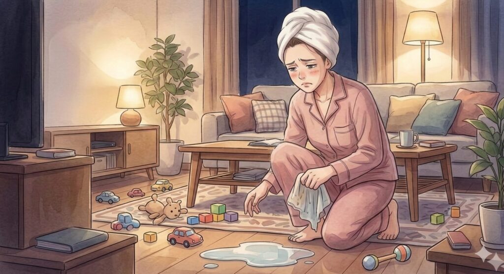 お風呂に入ったばかりなのに、おしっこの片付けをするってしんどすぎる…