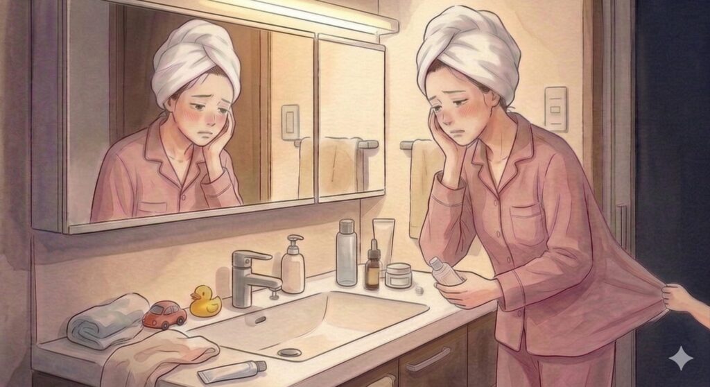ワンオペのお風呂上がりで特に辛いのは、自分のスキンケアが後回しになることです。