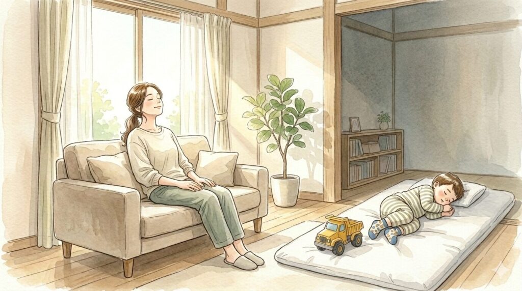 - 子どもがお昼寝した後には、ゆっくりソファに座って心を落ち着かせる