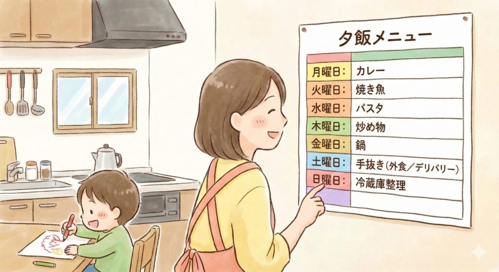 • 夕飯のメニューは曜日で決めて毎日悩まないようにする