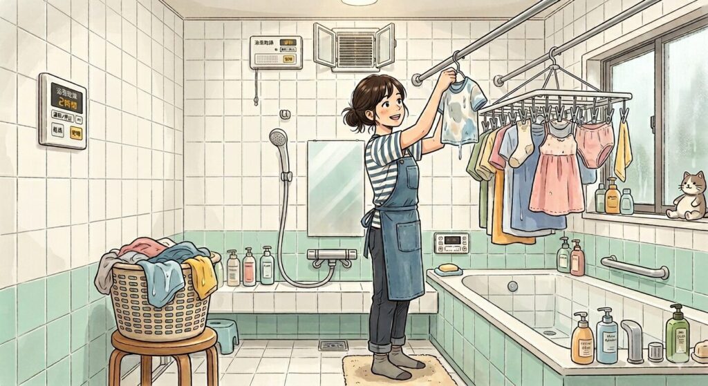 - 洗濯は、浴室乾燥を活用して、ハンガーでかけっぱなしの収納にする